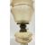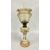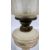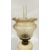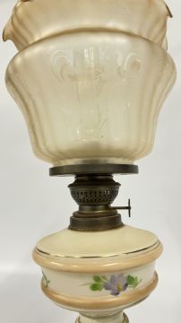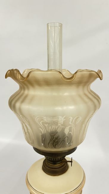 A VINTAGE OIL LAMP, MILK GLASS - HAND PAINTED FLORAL BASE AND AN ETCHED GLASS NOUVEAU STYLE SHADE.