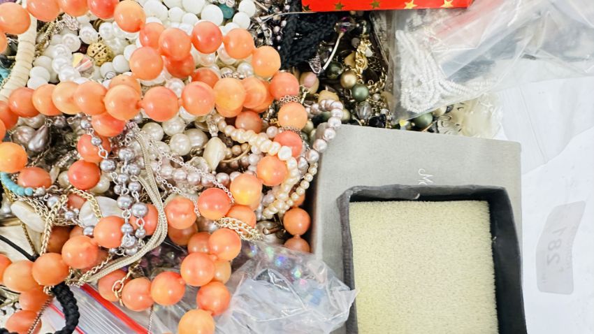 A TUB OF ASSORTED COSTUME JEWELLERY, BEADED NECKLACES, BRACELETS, COMPACT, PENDANTS AND EARRINGS ETC.