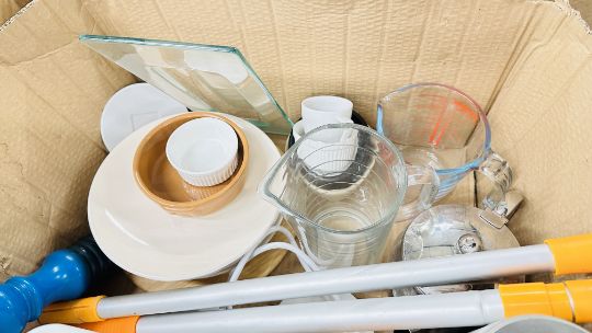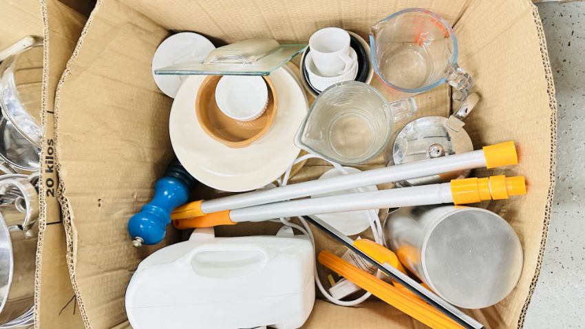 11 X BOXES HOUSEHOLD SUNDRIES TO INCLUDE SAUCEPANS, TOASTER, BOOKS, TABLEWARE, GLASSWARE, 18V HAMMER DRILL COMPLETE WITH CHARGER + TWO BATTERIES, A KIDDLE 3 STOREY ESCAPE LADDER, A ROBERTS CD PLAYER, ETC.