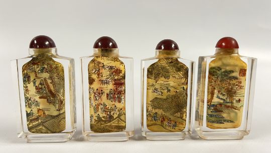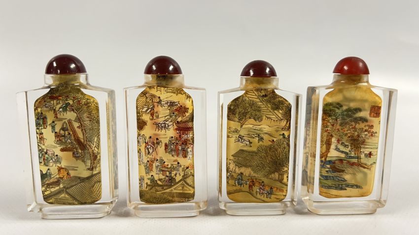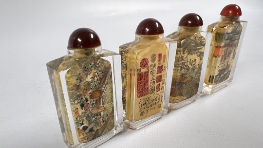 A BOXED SET OF 4 DECORATIVE ORIENTAL GLASS SNUFF / SCENT BOTTLES.