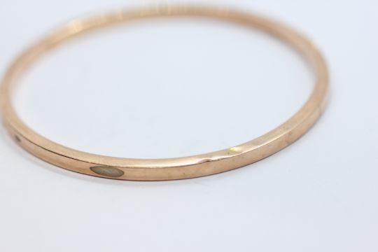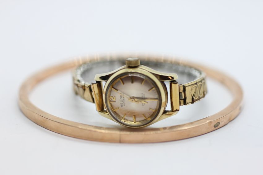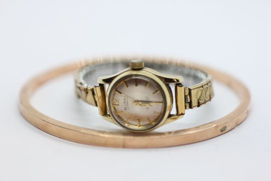 A 9CT ROSE GOLD PLATED BANGLE ALONG WITH A BELINDA AUTOMATIC LADY'S BRACELET WATCH WITH 25 JEWEL MOVEMENT.