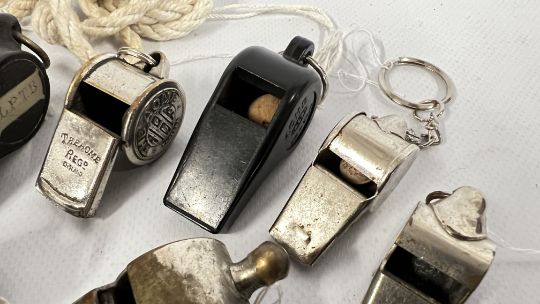 A TUB OF ASSORTED VINTAGE WHISTLES TO INCLUDE "THE ACME", A.R.P, ACME THUNDER AND CITY EXAMPLES.