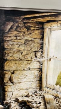 DAVID COWDRY: SWALLOW ENTERING A SHED, OIL ON CANVAS, 80 X 80CM.