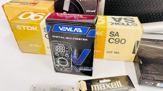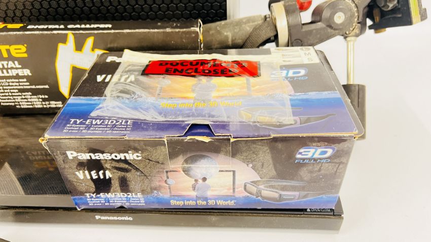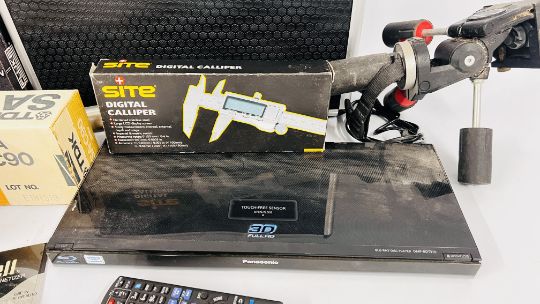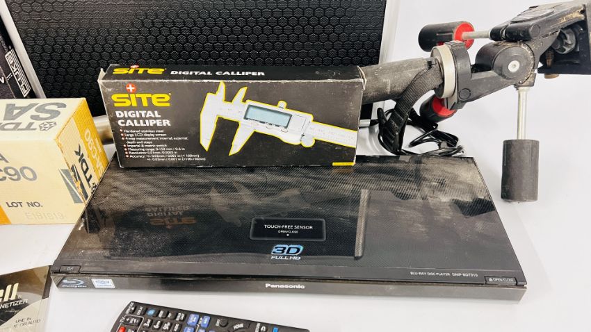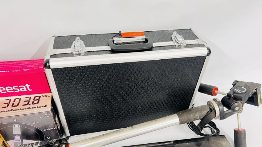 MASFROTTO GRUPPO PROFESSIONAL PHOTOGRAPHY MONO POD COMPLETE WITH TOP MOUNT PLUS AN AS NEW FLIGHT CASE AND BOX CONTAINING PANASONIC BLU-RAY 3D FULL HD DISC PLAYER, PANASONIC 3D FULL HD VIEWING GLASSES, QUANTITY UNUSED AUDIO CASSETTES, FLUKE MULTI METER AND BOXED FREESAT 4K TV BOX, SITE DIGITAL CALIPER AND VENAS DIGITAL MULTI METER - SOLD AS SEEN.