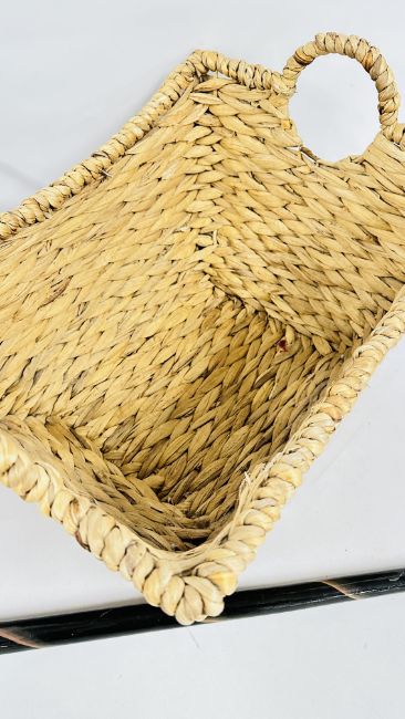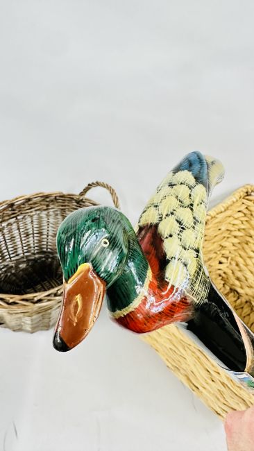 TWO BASKETS TO INCLUDE WICKER AND SEAGRASS + A LACQUERED WALKING STICK, THE HANDLE FASHIONED AS A DUCK.