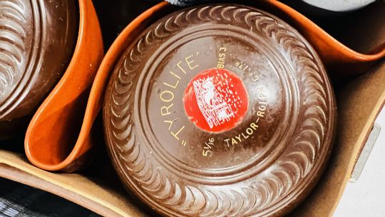 A SET OF 4 "TAYLOR-ROLPH & CO. LTD" TYROLITE 51/16 BIAS 3 BOWLS IN A FITTED CARRY BAG + A SET OF 4 "TAYLOR-ROLPH & CO. LTD" TYROLITE 4 7/8 BIAS 3 IN A DAWN DELUXE CARRY BAG.