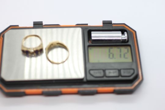 A 9CT GOLD VICTORIAN STYLE FIVE STONE AMETHYST RING (ONE STONE MISSING) AND 9CT GOLD BLUE STONE RING (ONE STONE MISSING).