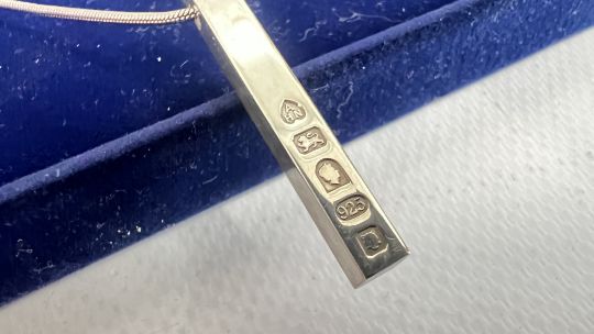 A DESIGNER SILVER JUBILEE TRIPLE BANGLE LONDON, MAKER A. HAVILAND-NYE & A SIMILAR PENDANT NECKLACE IN A FITTED PRESENTATION BOX.