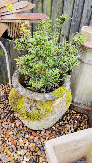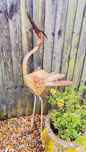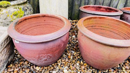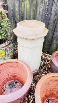 GROUP OF GARDEN POTS AND DECORATIVE EFFECTS TO INCLUDE FIVE SIMILAR SALT GLAZED STONEWARE POTS, CHIMNEY POT, STONEWARE URN STYLE POT, PLUS ONE OTHER, AND A METAL HERON.