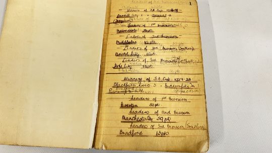 VINTAGE ORDER BOOK CONTAINING NEWSPAPER CUTTINGS RELATED TO VARIOUS SPORTING EVENTS AND A QUANTITY OF COINAGE CONTAINING COMMEMORATIVE EXAMPLES.
