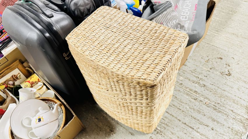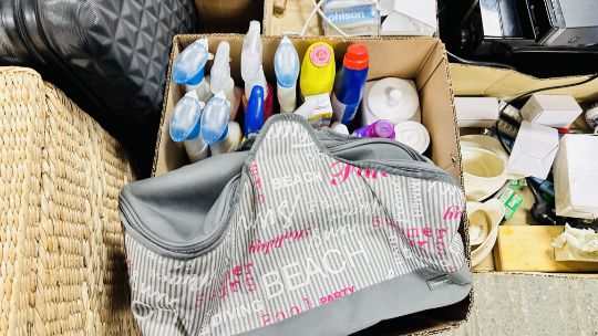 18 X BOXES OF ASSORTED HOUSEHOLD SUNDRIES TO INCLUDE GOOD QUALITY GLASSWARE, MORPHY RICHARDS IRON, HOTPOINT MICROWAVE, 2 X SUITCASES, BOOKS, CD'S AND RECORDS, CLEANING CHEMICALS, BOSCH HAMMER DRILL AND BOSCH CASED DRILL BITS, VARIOUS PRINTS AND ORIGINALS, CHRISTMAS DECORATIONS, METAL WINE RACK ETC. - SOLD AS SEEN.