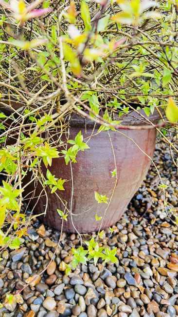 TWO LARGE GARDEN SHRUBS IN SALT GLAZED STONEWARE POTS.