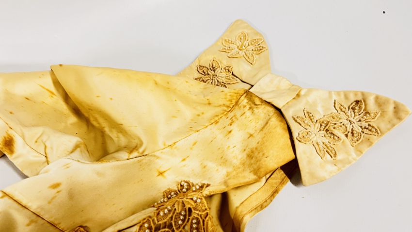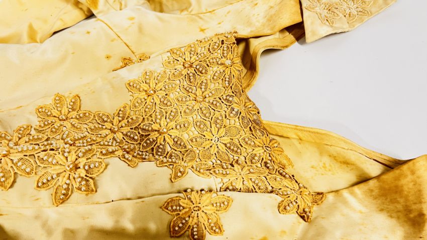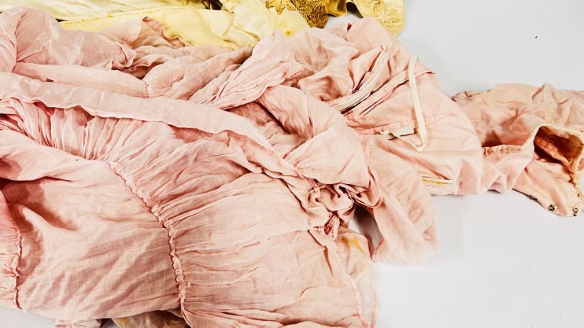 A GROUP OF VINTAGE HAND MADE UNDER GARMENTS AND A VINTAGE SATIN AND BEADED WEDDING DRESS BEARING ORIGINAL LABEL "LAURA PHILLIPS" (REQUIRE ATTENTION).