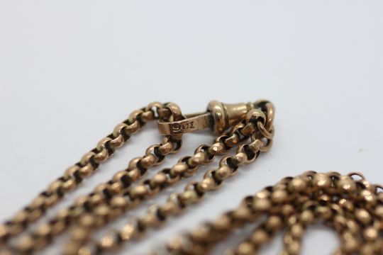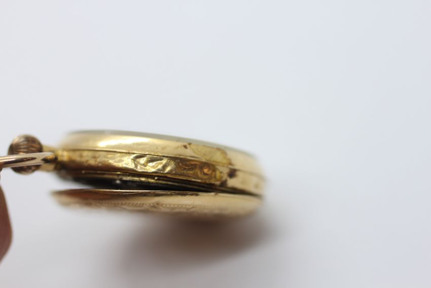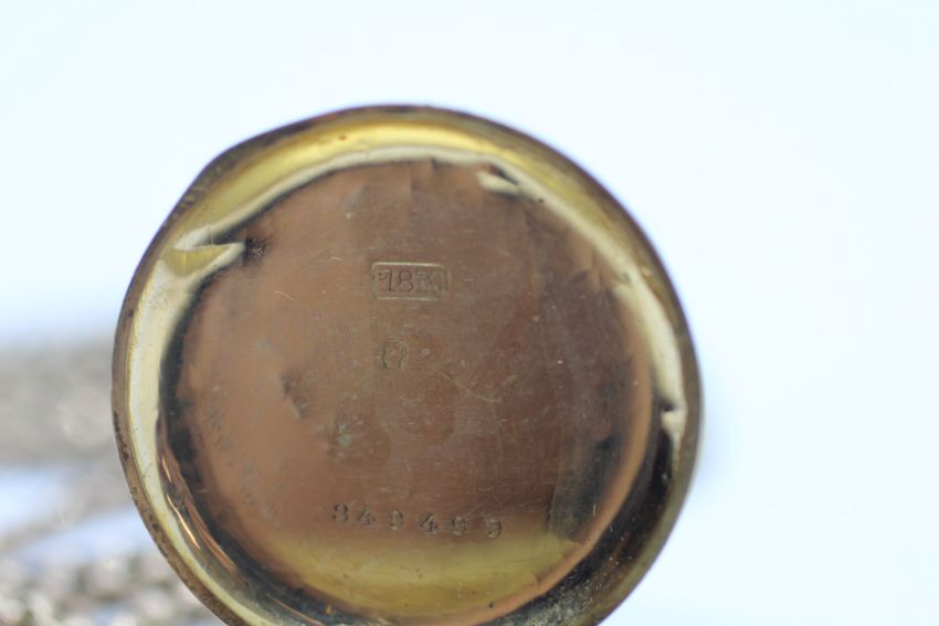 A LADY'S 18CT GOLD FOB WATCH, THE DIAL ENGRAVED WITH FLORAL DESIGN AND MARKED WITH ROMAN NUMERALS, STRUNG FROM A 9CT GOLD GUARD CHAIN.