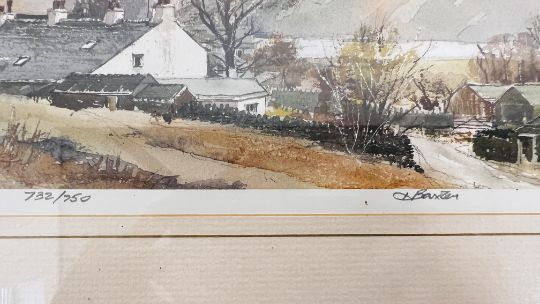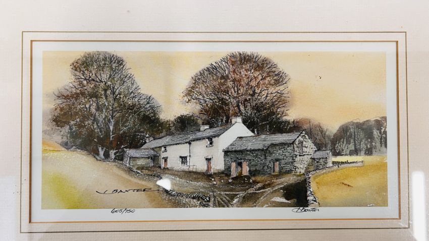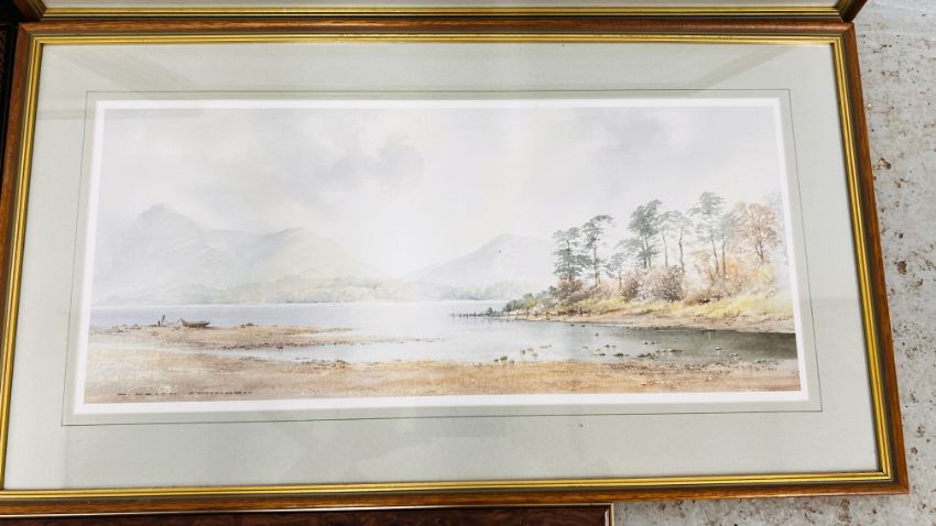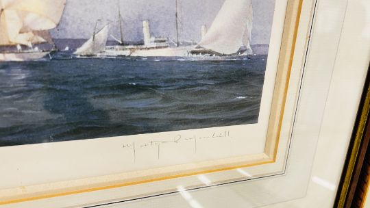 GROUP OF SIX FRAMED AND MOUNTED PRINTS DEPICTING COUNTRYSIDE AND COASTLINE SCENES TO INCLUDE TWO SIGNED LIMITED EDITION 'SAILING BOATS OF THE ROYAL YACHT SQUADRON' No. 353/395 AND 'THE ALBERTA DEPARTING PORTSMOUTH' No. 346/395 BY MARTYN MACKRILL, TWO FURTHER LIMITED EDITION SIGNED COUNTRYSIDE PRINTS BY L. BAXTER PLUS TWO OTHER PRINTS.