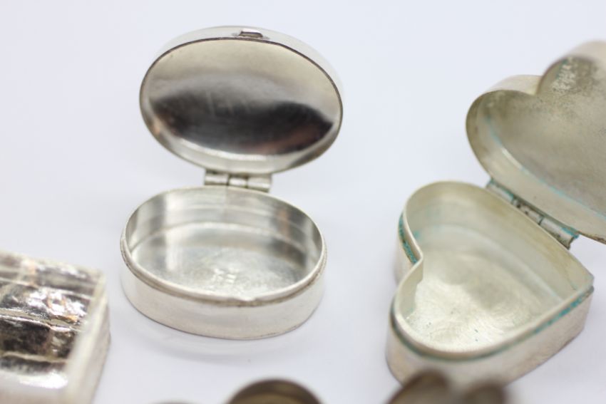 A GROUP OF 4 SILVER AND WHITE METAL TRINKET / PILL BOXES.