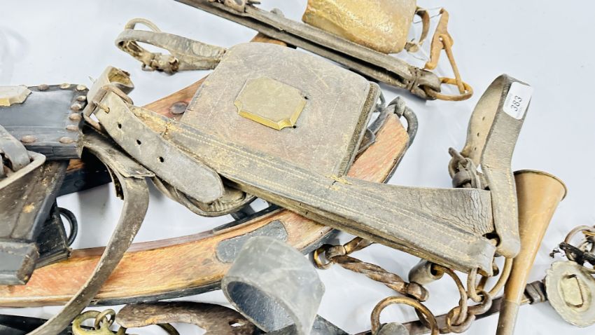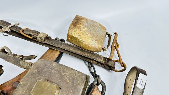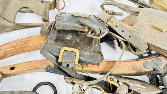 A GROUP OF VINTAGE HORSE TACK, HARNESSES, BITS AND BRIDLES & YOKE.