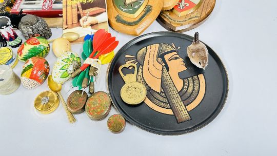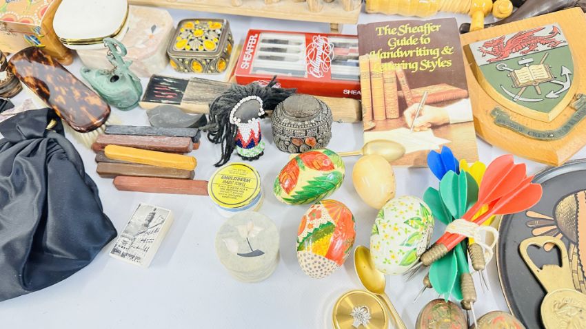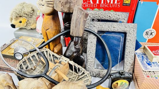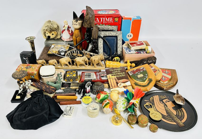 A BOX OF ASSORTED COLLECTIBLES TO INCLUDE ROYAL DOULTON FIGURINE, ETHNIC CARVINGS, TRINKET BOXES, PAIR OF PLATED PHOTO FRAMES ETC., STEIFF HEDGEHOG 070792 A/F, ARMORIAL SHIELDS.