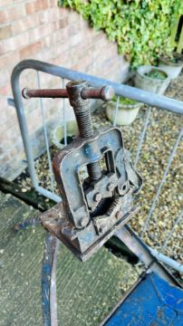A VINTAGE "RECORD" PIPE BENDER VICE & STAND + 3 X VINTAGE CHAIN WRENCHES.