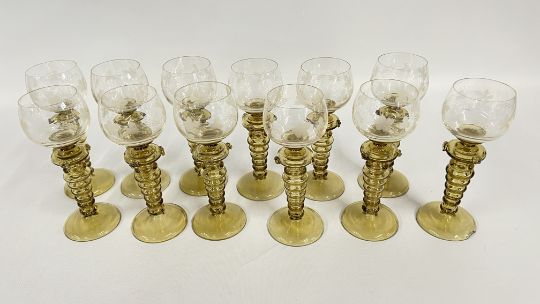 A SET OF 12 ANTIQUE ROEMER HOCK WINE GLASSES IN THE FRITZ HECKERT STYLE (3 X A/F).