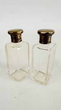 AN ANTIQUE DREW & SON'S LEATHER TRAVEL CASE CONTAINING A PAIR OF GLASS BOTTLES, THE SILVER TOPS MARKED LONDON 1924.