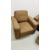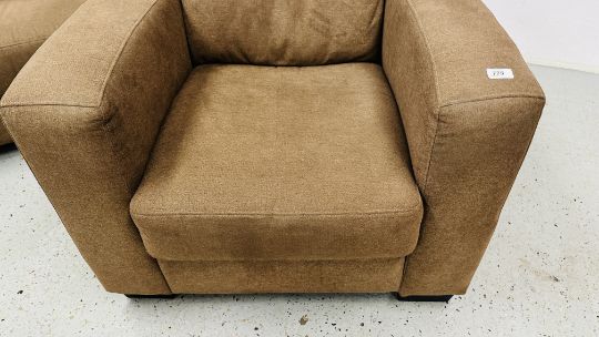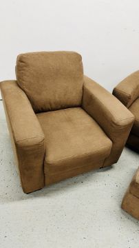 A MODERN FAWN UPHOLSTERED TWO SEATER SOFA, PAIR OF MATCHING ARMCHAIRS AND FOOTSTOOL (SOFA SHOWS SIGNS OF WEAR).