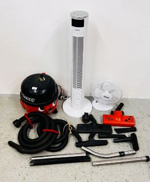 HOUSEHOLD ELECTRICALS TO INCLUDE HENRY VACUUM CLEANER PLUS ACCESSORIES, VONHAUS TOWER FAN PLUS A ICYCOOL TABLE FAN - SOLD AS SEEN.