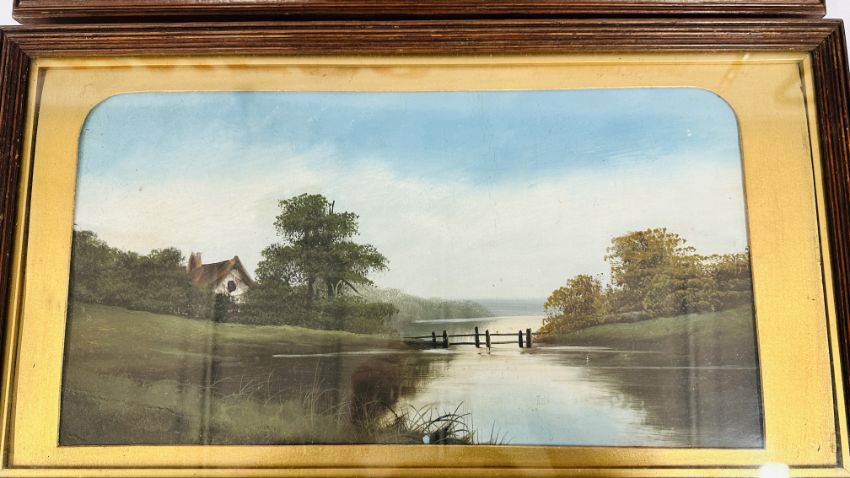 A PAIR OF FRAMED AND MOUNTED OIL PAINTINGS DEPICTING RIVER SCAPES UNSIGNED (W 57 X H 32CM INCLUDING FRAME).