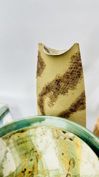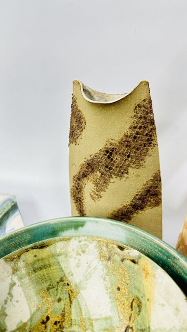 GROUP OF STUDIO POTTERY TO INCLUDE HEATHER GRAHAM JUG PALE GREEN GLAZE, HEATHER GRAHAM SMOKE-FIRED FIGURE HEIGHT 35CM, VASES, BOWLS, PLATES, DECORATIVE CANDLE HOLDER MARKED DAVID MOORE FRIARS KINGS LYNN TO BASE, ETC.