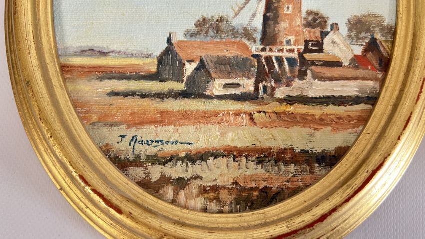 A PAIR OF OVAL GILT FRAME OIL ON BOARD BROADLAND SCENES TO INCLUDE THURNE & CLEY MILL BEARING SIGNATURE J.ADAMSON (W 22.5 X H 28.5CM INCLUDING FRAME).