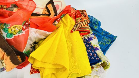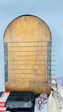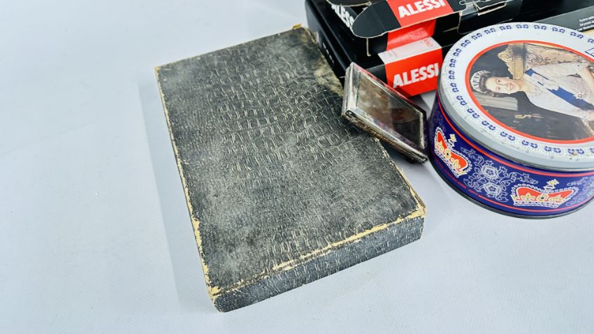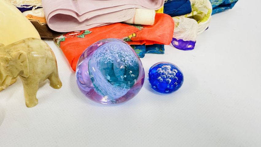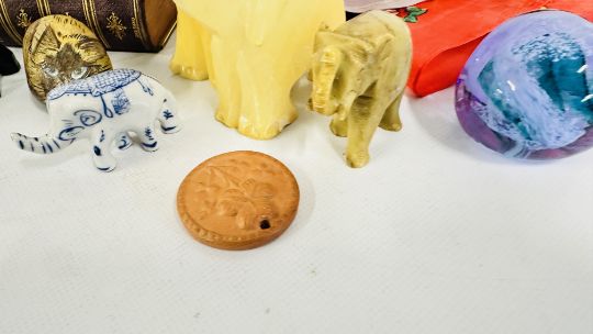 A GROUP OF COLLECTIBLES TO INCLUDE A SMALL SILVER MOUNTED PHOTO FRAME, COMMEMORATIVE TIN, PRINTING NUMBERS, 14 X PIECES OF ALESSI NUOVO MILANO CUTLERY, ELEPHANT ORNAMENTS TO INCLUDE POLISHED ART STONE AND ENAMEL EXAMPLES, A FAY HUTCHINS CAT PAPERWEIGHT FASHIONED FROM A PEBBLE, BOX OF SCARVES TO INCLUDE SCREEN PRINTED EXAMPLES, SHOVE HA'PENNY BOARD ETC.