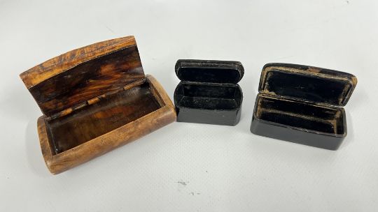 A GROUP OF THREE VINTAGE SNUFF BOXES TO INCLUDE A BLACK PAPER MACHE INLAID LACQUERED EXAMPLE TITLED "A PRESENT FROM BLACKPOOL".