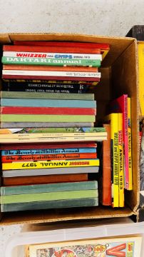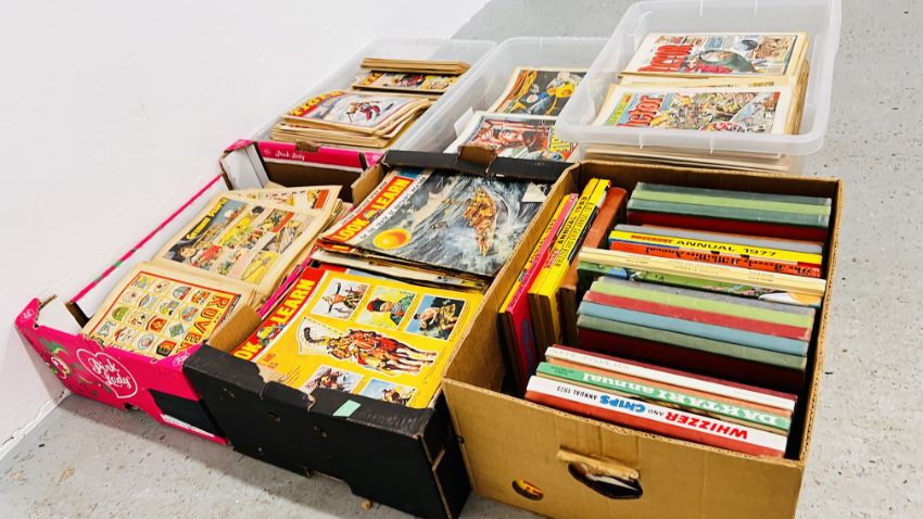 A COLLECTION OF CHILDREN'S ANNUALS TO INCLUDE 1950'S RADIO FUN, EAGLES ANNUALS 1 THROUGH TO 9 (1950'S) PLUS OTHERS ALONG WITH APPROX 200 VICTOR COMICS FROM EARLY 1970'S - 1990'S, TIGER COMICS FROM 1969 - 1970, SECOND ISSUE EAGLE COMICS, EARLY 1960'S ROVER AND WIZARD COMICS + LOOK AND LEARN COMICS - APPROX 150 STARTING FROM THE FIRST 100 ONWARDS.