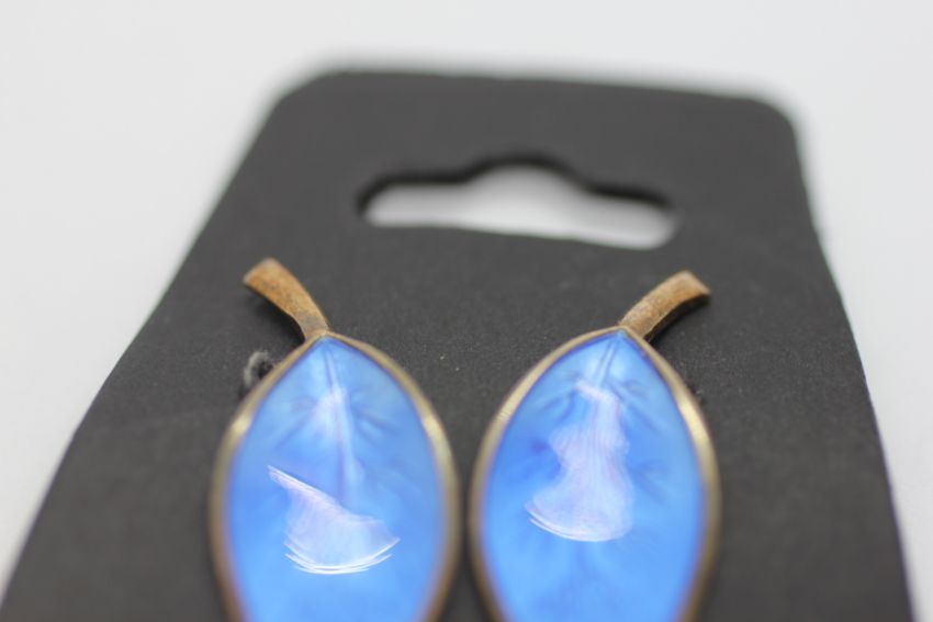A PAIR OF DESIGNER DAVID ANDERSON NORWEGIAN SILVER GILT AND ENAMEL CLIP ON BLUE LEAF EARRINGS.