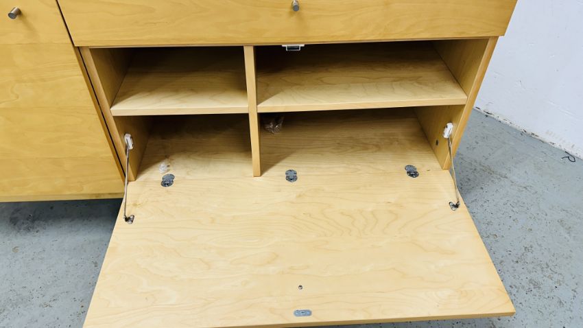 BEECHWOOD FINISH TWO DRAWER ONE DOOR SIDEBOARD, W 144 X D 45 X H 75CM.