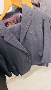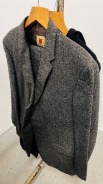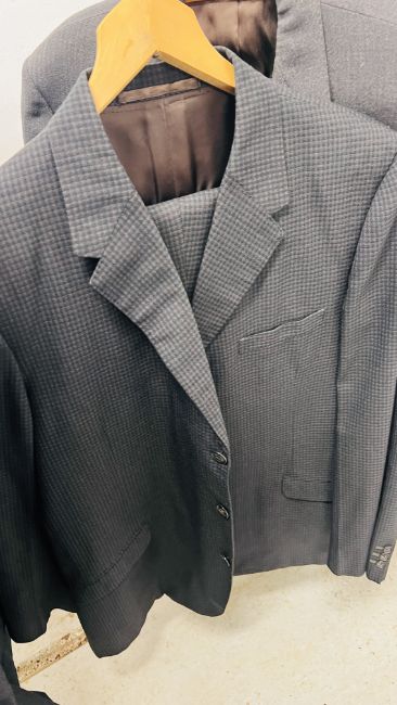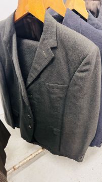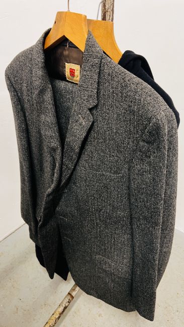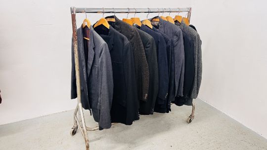 A GROUP OF NINE VINTAGE TWO PIECE GENT'S SUITS TO INCLUDE PARK ROW, C OF L & J & J. EDWARDS EXAMPLES + A SINGLE BURTONS JACKET & A FORWARD DUFFLE STYLE COAT.