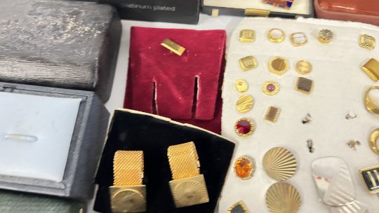 A BOX CONTAINING AN EXTENSIVE GROUP OF ASSORTED CUFF LINKS AND TIE PINS, ENAMEL, SILVER AND WHITE METAL EXAMPLES ETC.