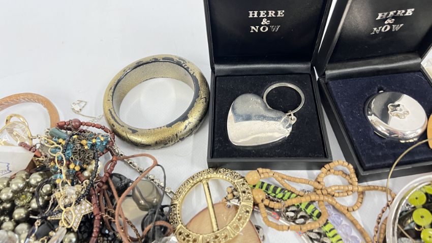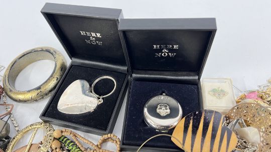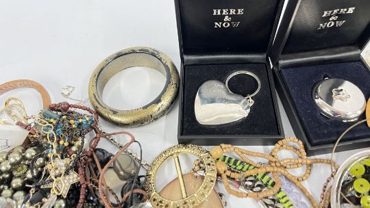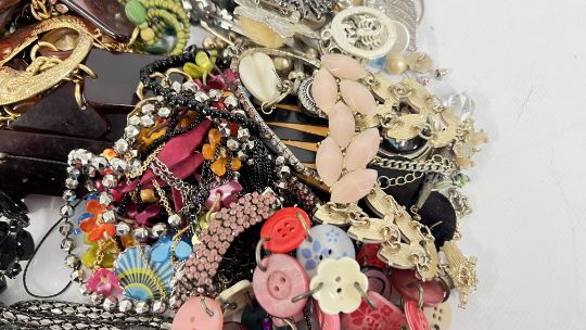 A BOX OF ASSORTED COSTUME JEWELLERY TO INCLUDE BEADED NECKLACES, BANGLES, EARRINGS AND BROOCHES ETC.