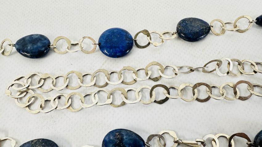 TWO MODERNIST WHITE METAL BROOCHES, ONE MARKED 900 + A SIMILAR STYLE SILVER RING & A LAPIS NECKLACE.