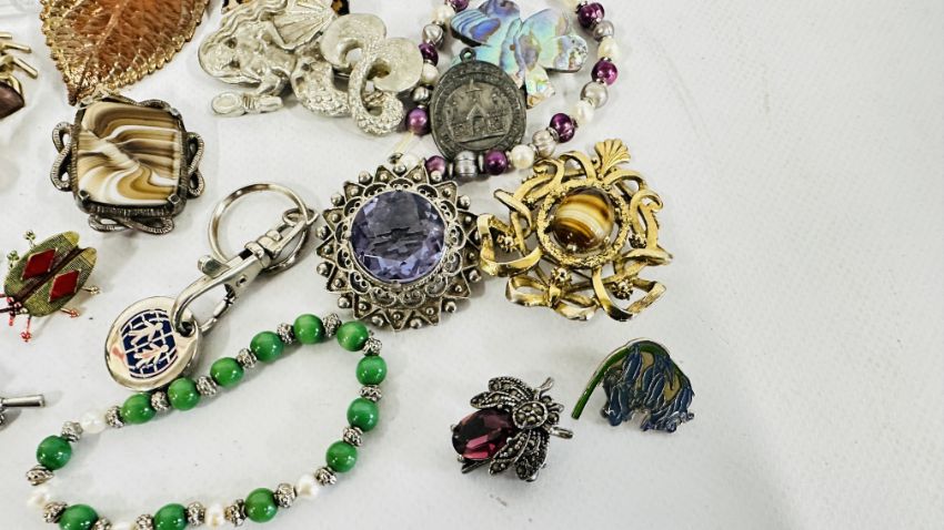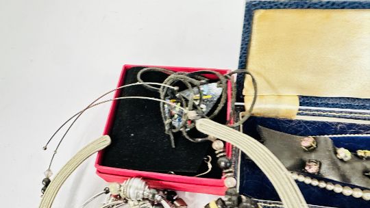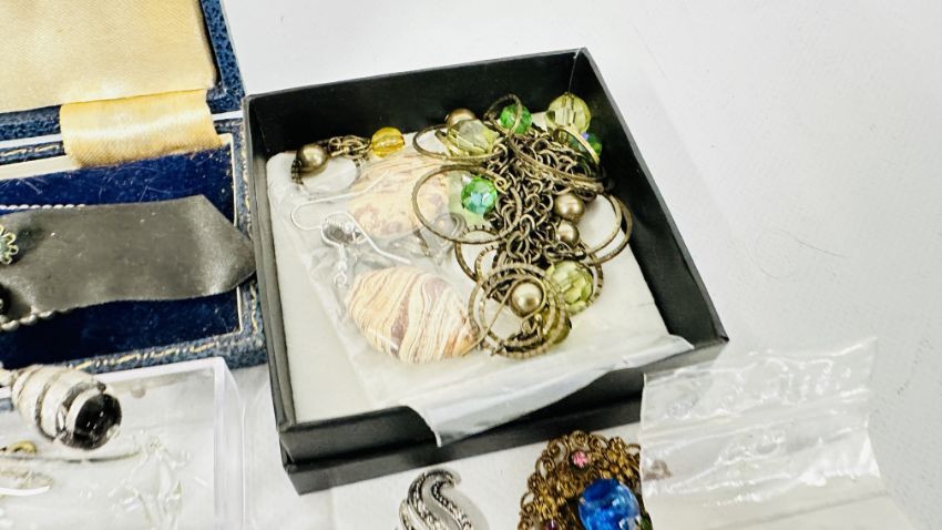 A GROUP OF ASSORTED COSTUME JEWELLERY TO INCLUDE A SINGLE ROPE OF GRADUATED CICERO PEARLS IN CASE, EARRINGS, PENDANTS, NECKLACES, BROOCHES, ETC.