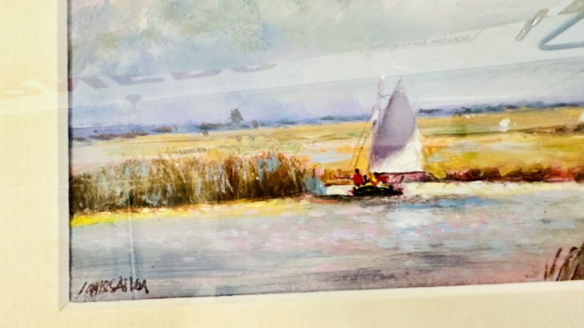 A FRAMED AND MOUNTED OIL ON BOARD "SAILING BY NORFOLK" BEARING SIGNATURE JAMES ALLEN, 17CM X 12CM.