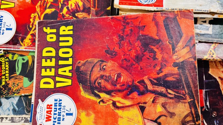 A VINTAGE SUITCASE & CONTENTS TO INCLUDE ASSORTED VINTAGE WAR RELATED COMICS A FLEETWAY LIBRARY, BATTLEGROUND, SILHOUETTE & COMMANDO EXAMPLES.