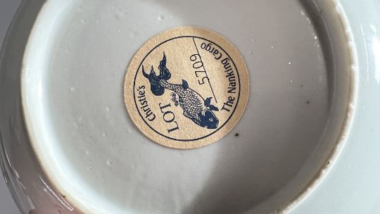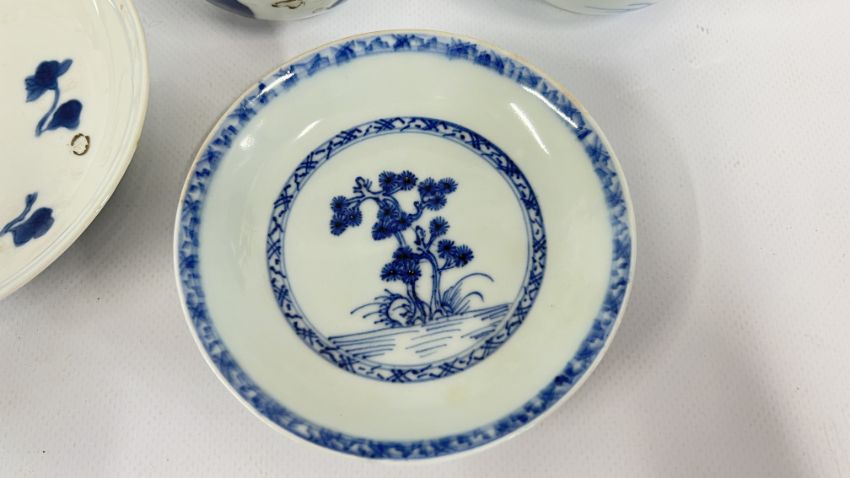 TWO CHINESE NANKING CARGO BLUE AND WHITE TEA BOWLS AND SAUCERS RETAINING ORIGINAL CHRISTIES LABELS LOT 5709 & LOT 5528.