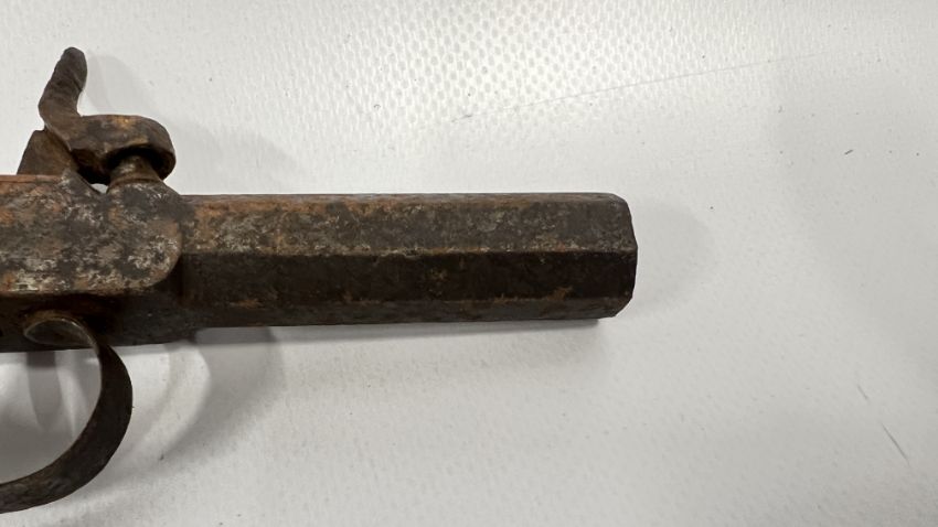 AN ANTIQUE PERCUSSION CAP PISTOL, NO MAKERS MARK (L 17CM TOTAL LENGTH).