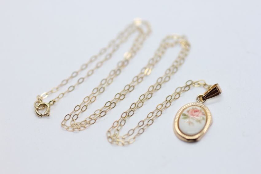 A 9CT GOLD FLOWER PENDANT SUSPENDED ON A FINE 9CT GOLD CHAIN.