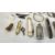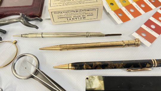 A TRAY OF COLLECTIBLES TO INCLUDE SILVER FRUIT KNIFE AND SEED PICKER, VINTAGE LIGHTERS, FLASK AND STANLEY GIBBONS STAMP COLOUR KEY AND PENCILS ETC.