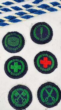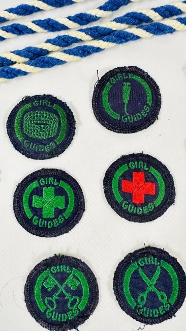 A GROUP OF VINTAGE GIRL GUIDES COLLECTIBLES TO INCLUDE CLOTH BADGES, PATROL ROLL AND SUBSCRIPTION BOOK, WHISTLE REG 494339 + AN UNRELATED POCKET KNIFE AND MULTI TOOL AND VARIOUS VINTAGE ENAMEL BADGES.
