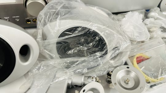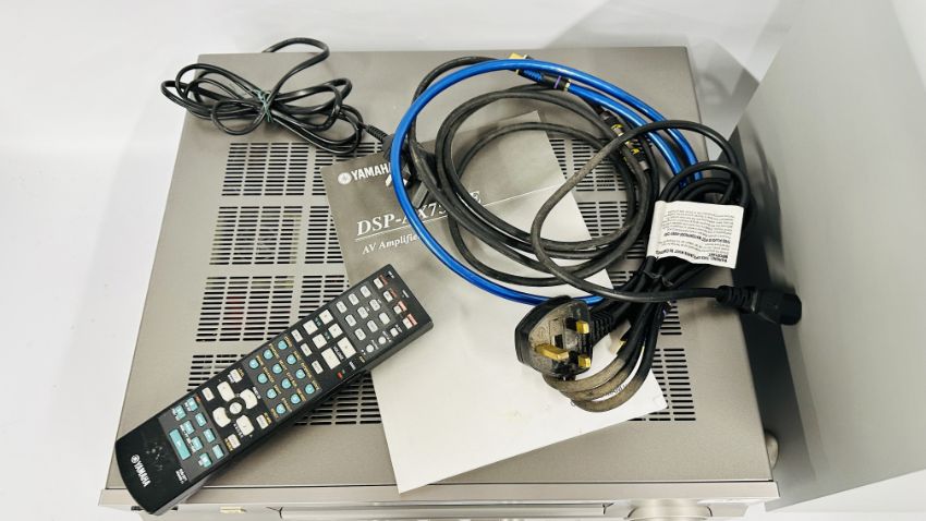 YAMAHA NATURAL SOUND AV AMPLIFIER DSP-AX759SE COMPLETE WITH INSTRUCTION BOOK AND REMOTE PLUS KEF 5.1 SPEAKER SYSTEM TO INCLUDE PSW 2010 KHT 2005.2 PSW 2010 POWERED SUBWOOFER WITH INSTRUCTIONS (NO CABLE), FIVE KHT 2005.2 HTS 2001 SATELLITE SPEAKERS, WALL MOUNT HARDWARE AND CABLES - SOLD AS SEEN.