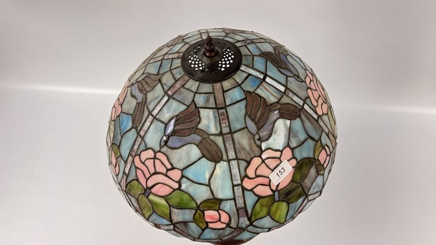 A REPRODUCTION TIFFANY STYLE TABLE LAMP, THE SHADE LEADED AND DECORATED WITH PINK ROSES.