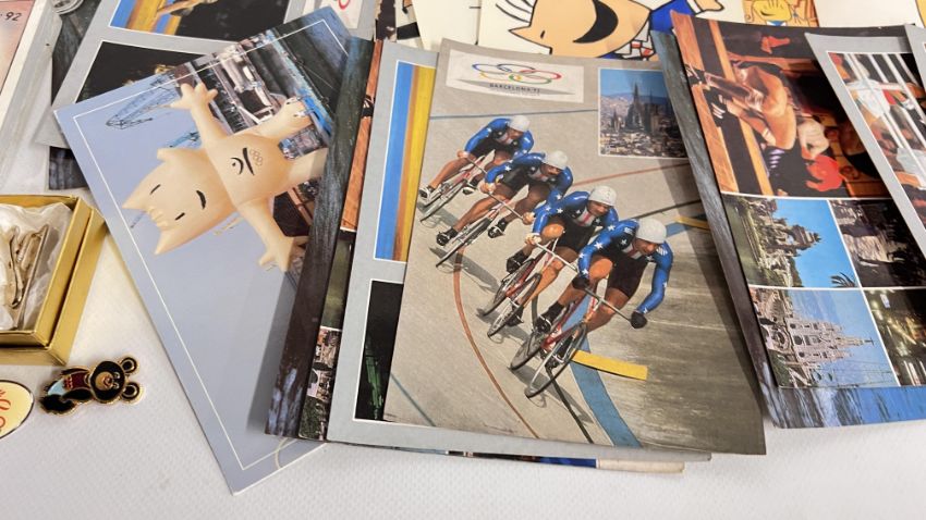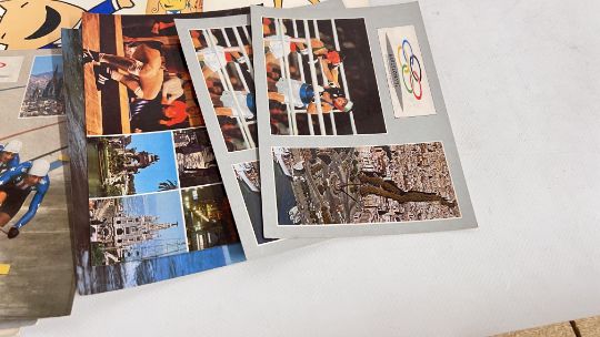 A GROUP OF SPORTING MEMORABILIA TO INCLUDE A TOKYO 1968 OLYMPIC GAMES TIE BAR, BARCELONA 92 PLAYING CARDS & POSTCARDS + 1970'S ITALIAN FOOTBALL CARICATURES PLAYING CARDS ETC.
